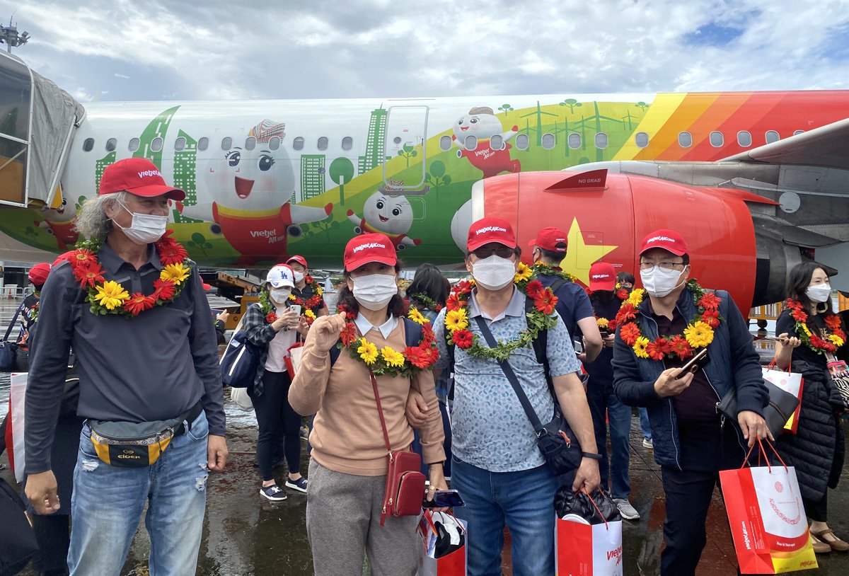 (TITC) - At 12:00 on November 20, 2021, Vietjet Air's VJ3749 flight with 202 Korean tourists from Incheon (Korea) landed at Phu Quoc International Airport, Kien Giang Province, Vietnam.