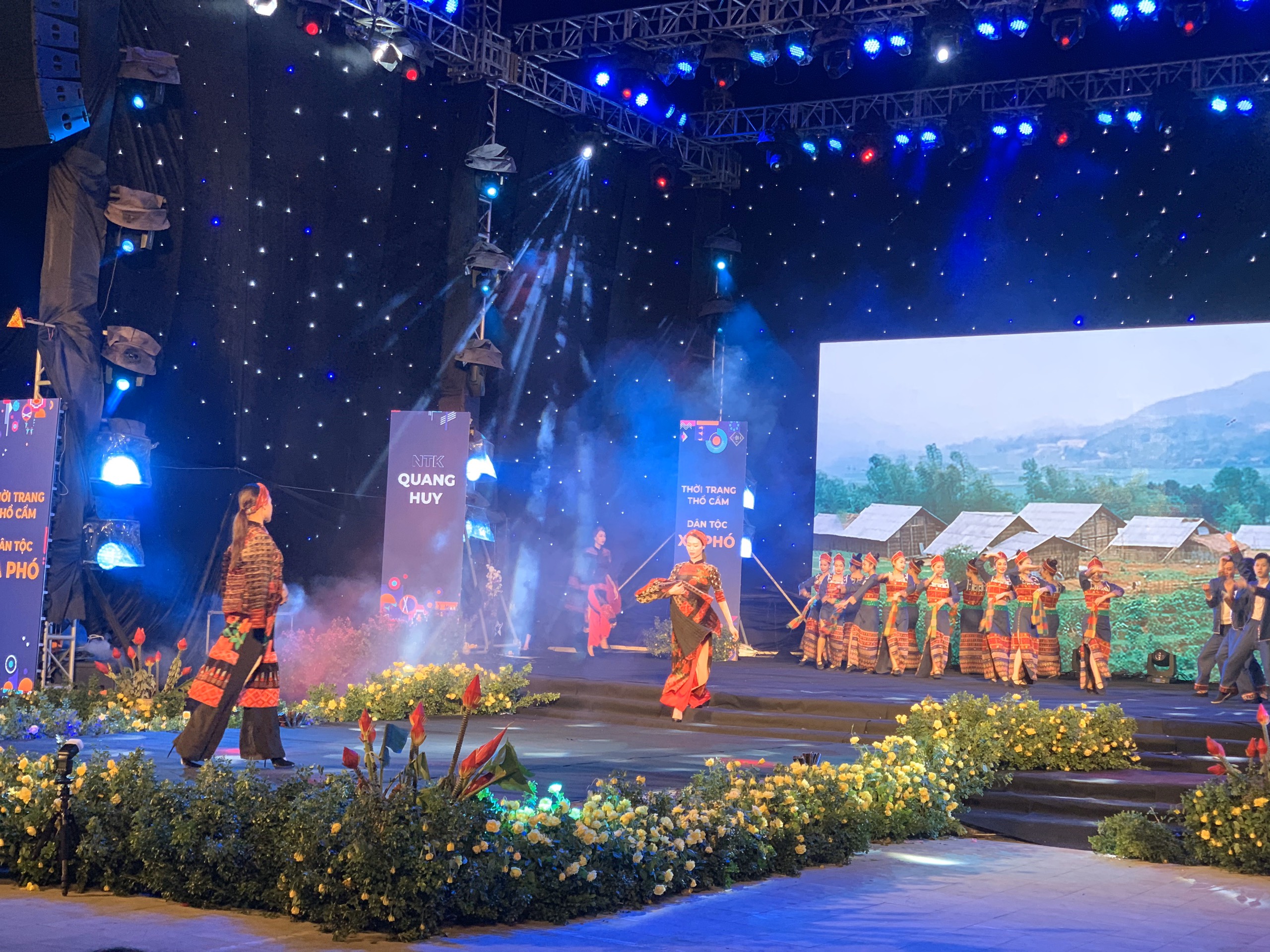 At the opening ceremony, people and visitors enjoyed the art fashion show with the theme "Northwest Brocade - Love Story ". The show brought love stories associated with brocade costumes, textures and colors combining music effects, lighting, artistic stage installations, dance, which proves the intense vitality and perfect creativity, honoring the unique and characteristic beauty of ethnic costumes. The program had the participation of many famous designers and artists of Vietnam.