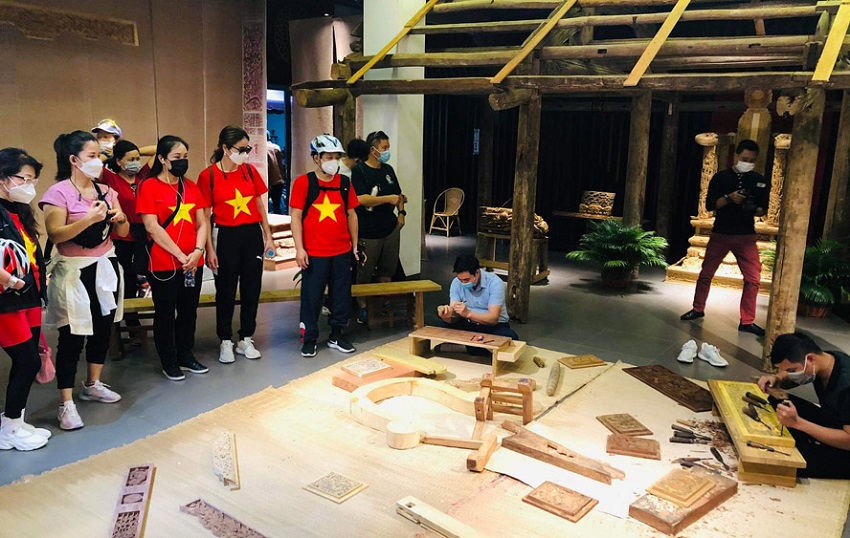 During their pedaling itineraries, travelers have the chance to visit Hanoi’s Cultural Exchange Center (No 50 Dao Duy Tu Street, Hoan Kiem District) to admire some typical products of Ang Phao Traditional Carpentry Village and learn about the history of the village. Photo: VietFoot Travel