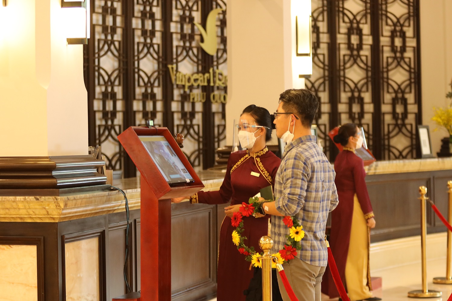 Inside the resort lobby, messages in Korean language were delicately set, bringing a feeling of both formality and familiarity. From the check-in step, a large number of tourists were interested in taking photo of face recognition applying AI artificial intelligence technology, which makes it convenient to move and use other facilities in the complex.