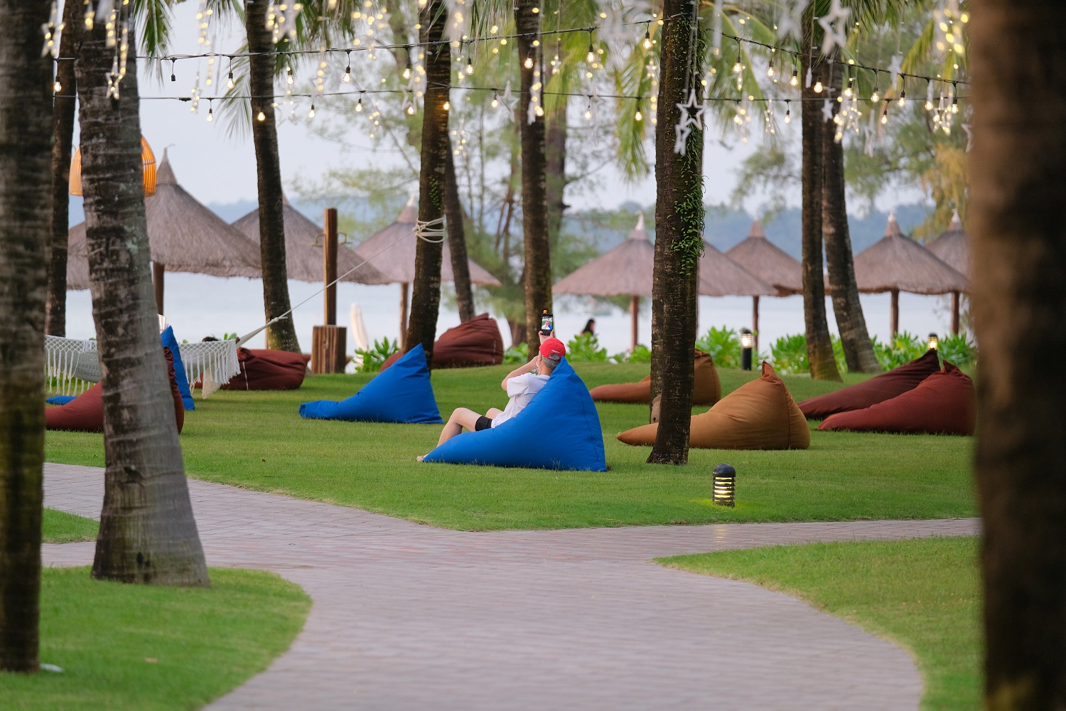 Families take a stroll together or simply choose a private corner to relax on the green grass, blowing in freshness and full of laughter in the 5-star resort of Vinpearl.