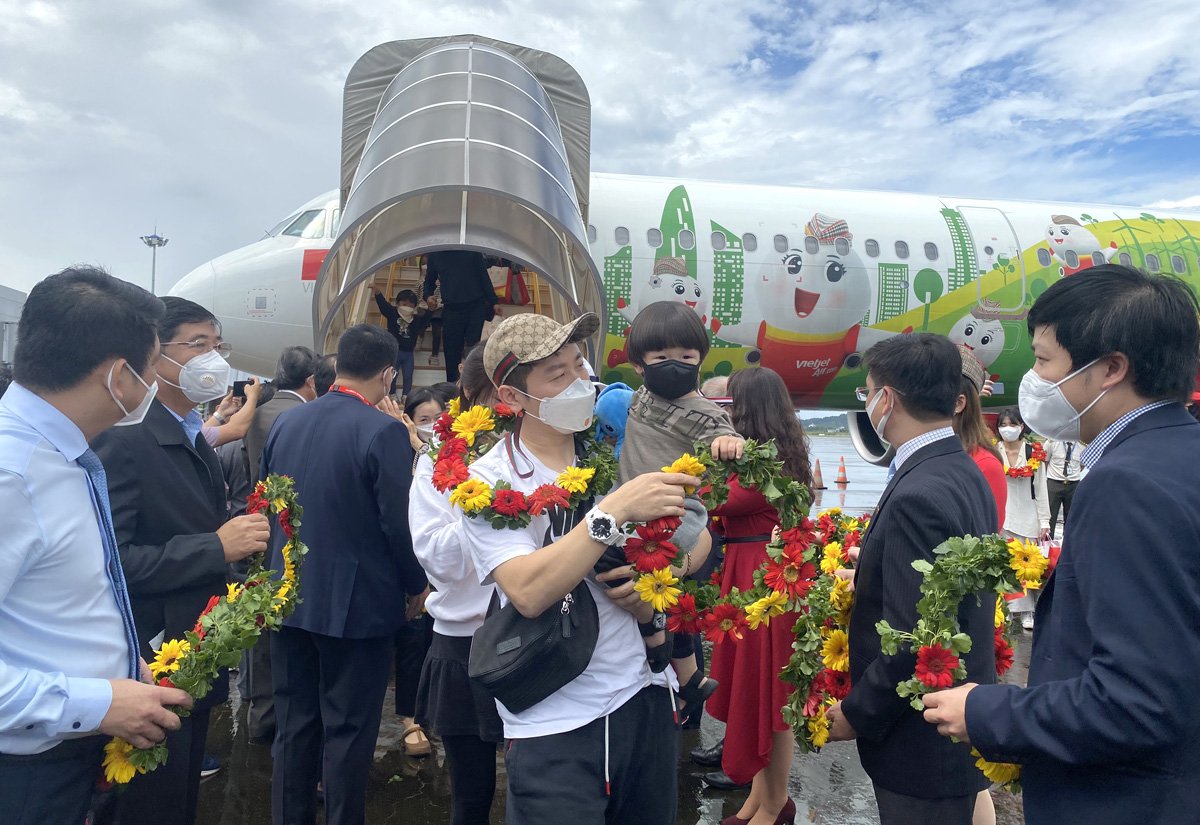 Earlier, on November 20, 2021, Vietjet Air's VJ3749 flight with 202 Korean tourists from Incheon (Korea) landed at Phu Quoc International Airport, Kien Giang Province, Vietnam. The delegation was solemnly welcomed by Vietnam National Administration of Tourism (VNAT), Vietjet Air, Kien Giang Provincial People's Committee and related units.