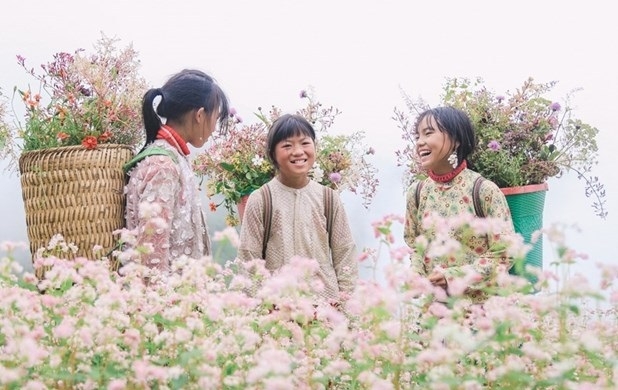 Children in Ha Giang stand at a buckwheat flower field (Photo: VNA)