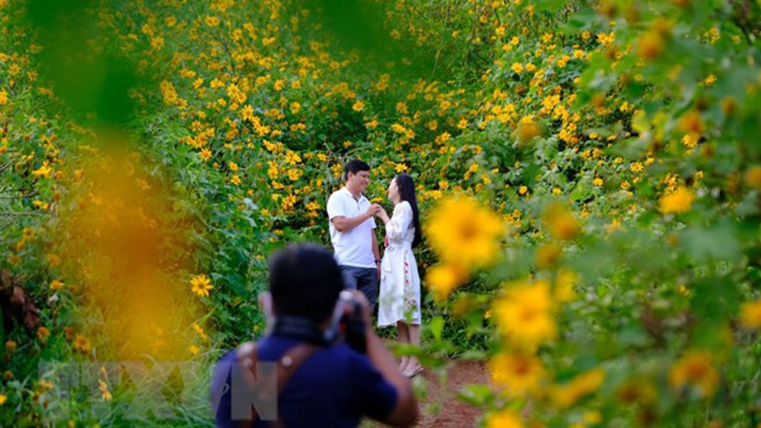 Visitors pose for a photo at a tourist destination in Dalat City – PHOTO: VNA
