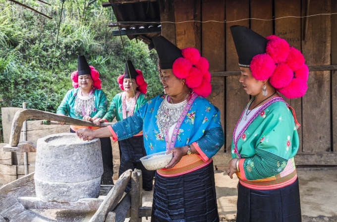 H’mong ethnic women in Co Ma Commune, Thuan Chau District, Son La Province, grinding corn for making corn cake (Photo credit: Pham Thanh Ha)