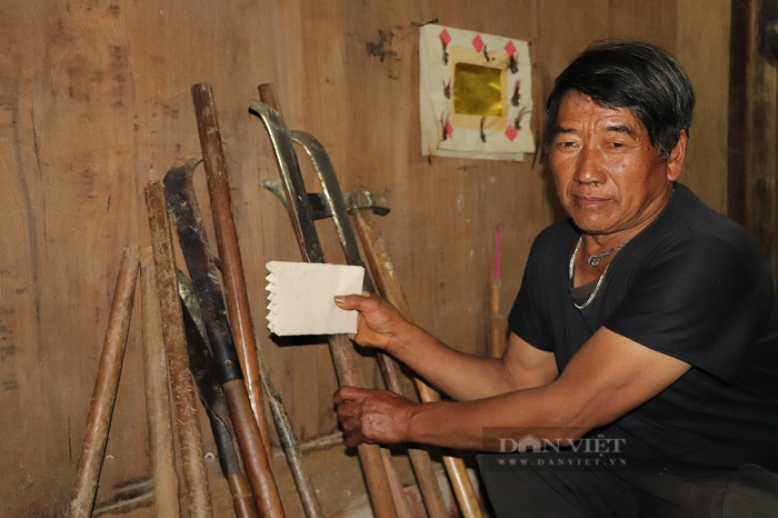 A H’mong ethnic man in Co Ma Commune preparing to paste pieces of paper to the serrated edge of his labour tools (Photo: danviet.vn)