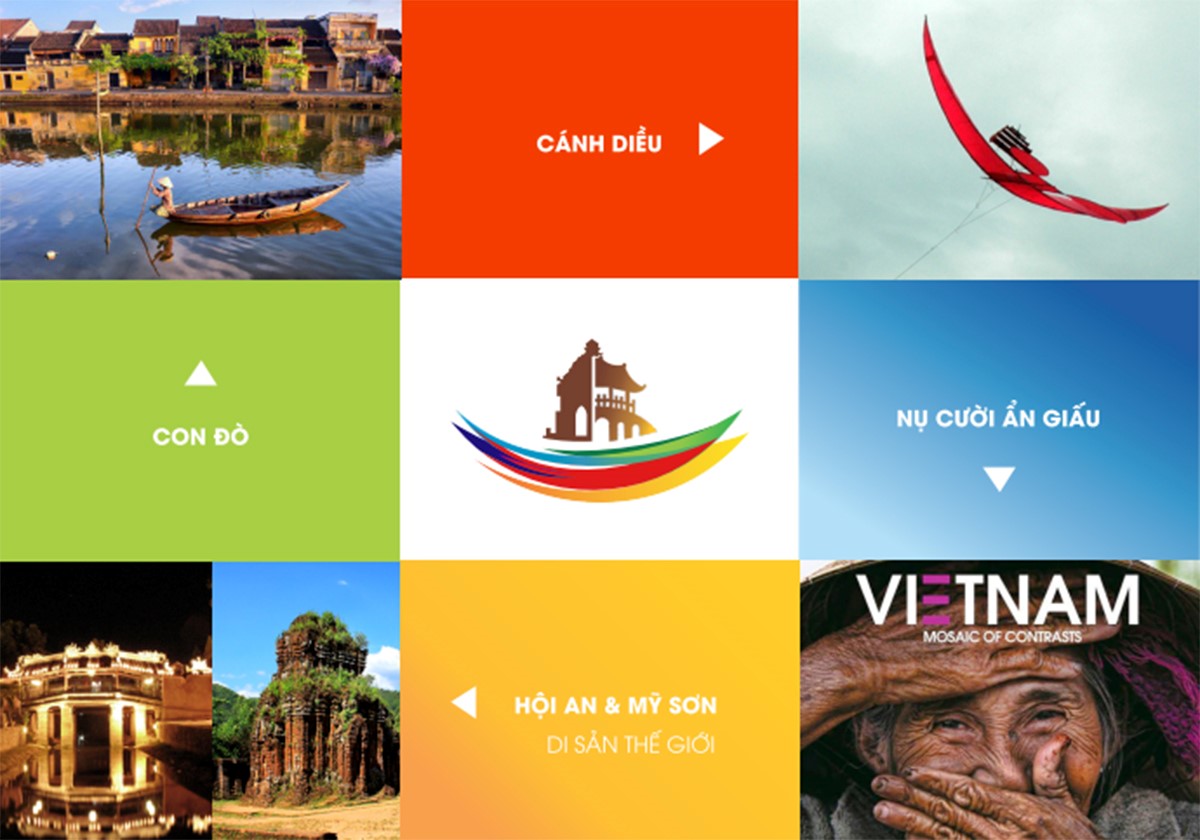 In terms of colours, the logo appears under 4 main tones: green of nature (illustrated for green tourism); blue of the sea; yellow-orange colour represents cultural heritage; and red for culinary. These are also the main colours in the logo of Vietnam tourism, the tourism logo in 5 localities in affiliated groups: Quang Nam - Da Nang - Thua Thien Hue - Quang Tri - Quang Binh. The colour choice of the logo is inspired by the blend of the cultural and natural riches of Quang Nam land, at the same time shows the typical vividness of the colourful Visit Vietnam Year event.