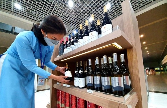 A staff arranges goods at a duty free store at the Tan Son Nhat airport as it prepares to welcome international tourists. (Photo tuoitre.vn)
