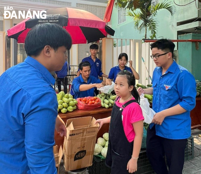 The fresh vegetables, fruits, and other essentials exchanged at the market were donated by vendors from the Hoa Cuong wholesale market, mobilised by the Youth Union. Volunteers were present at the market from 5:00 am, sorting and transporting the produce to be neatly arranged on the shelves.