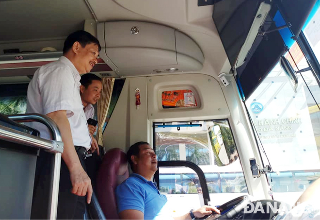 Vice Chairman Dung (left) checking surveillance cameras installed in a tourist coach