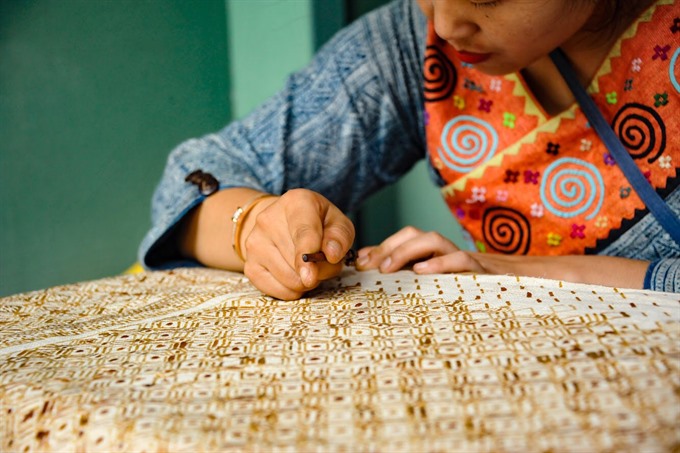 Detailed: Sùng Thị Pà applies bees wax to cloth to create unique patterns. VNS Photo Hiếu Nguyễn