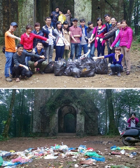 A group of young people clean up rubbish at the Old Church in Ba Vi National Park, in Hanoi’s Ba Vi District. (Photo courtesy of Cao Manh Tuan)
