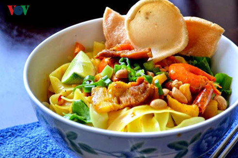 Quang noodle soup (Mi Quang) has rice noodle, prawns, meat, vegetables, and little broth