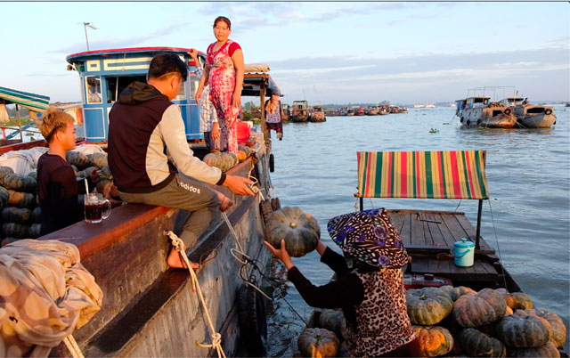 A typical river tour starts at Long Xuyen floating market, which is bustling with people and boats very early from the breaking dawn. Each of the boat is hung with ‘cay beo’ - a long pole which is attached with a bunch of fruits or flowers atop so that customers can see which goods are sold and are on sale on the boat from distance. The goods vary from things like watermelon, banana, fresh coconut, and pumpkin.