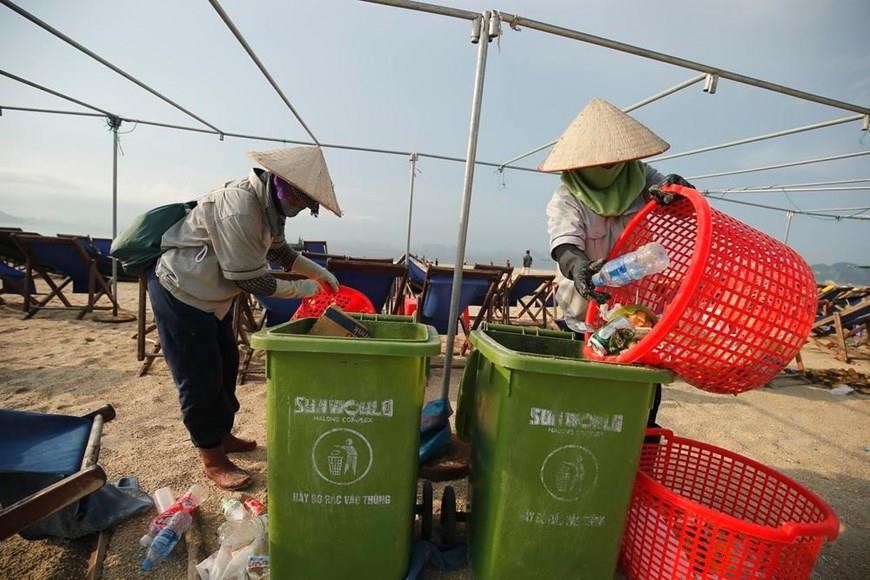 Environmental workers sort waste on a beach of Ha Long Bay in Quang Ninh province (Photo: VNA)