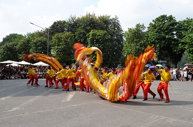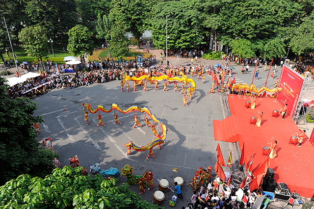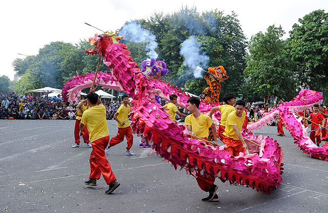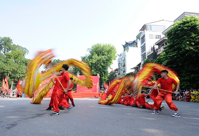 The 2019 Hanoi Dragon Dance took place at the intersection of Dinh Tien Hoang and Hang Dau streets, in Hoan Kiem Lake's pedestrian area, on October 6, to celebrate the 65th anniversary of the capital’s Liberation Day (October 10).