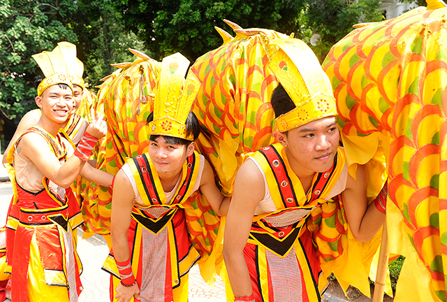Members of dragon dance team from Dong Anh District preparing for show-time.