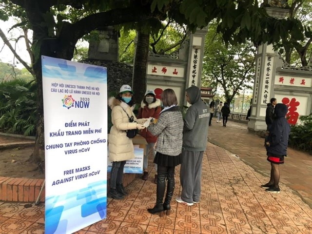 Tourists receive free masks in front of Ngoc Son Temple, a tourist spot near Hoan Kiem Lake (Source: VNA)