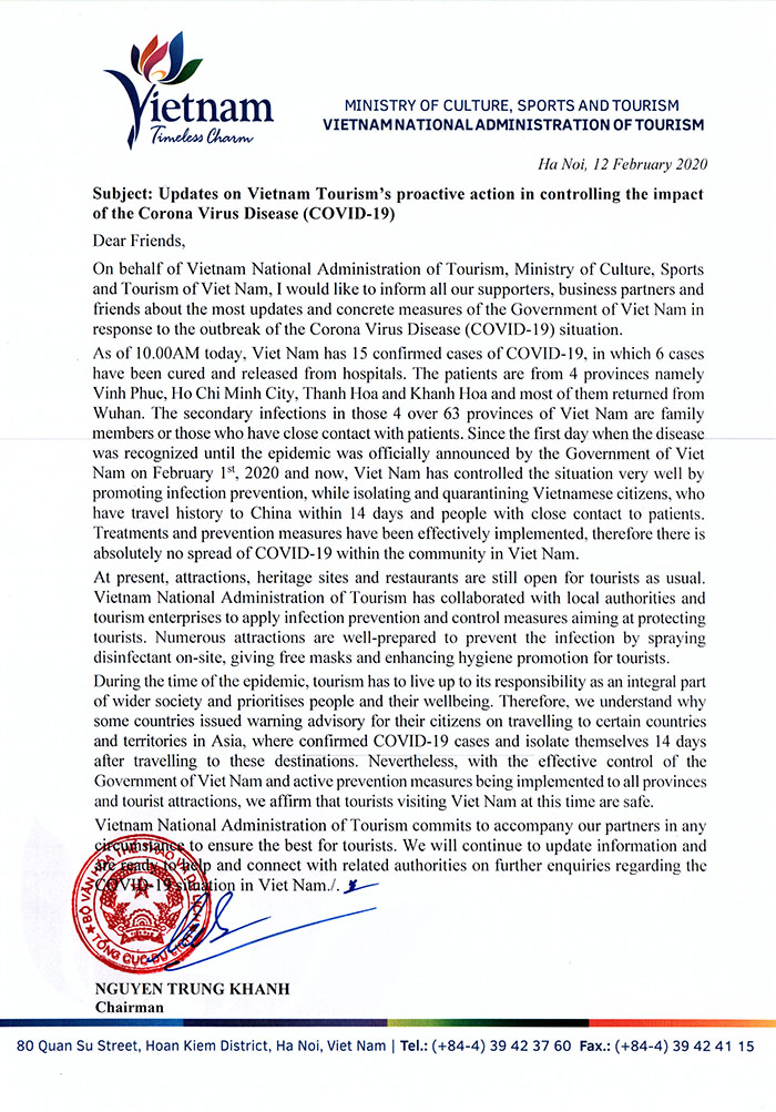 12 February 2020: VNAT’s Chairman Nguyen Trung Khanh sends letter to international partners confirming tourist spots in Viet Nam still open
