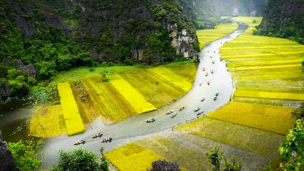 Boats travelling along the Ngo Dong river in Tam Coc, part of the UNESCO-recognised Trang An natural and cultural heritage complex in Ninh Binh province.