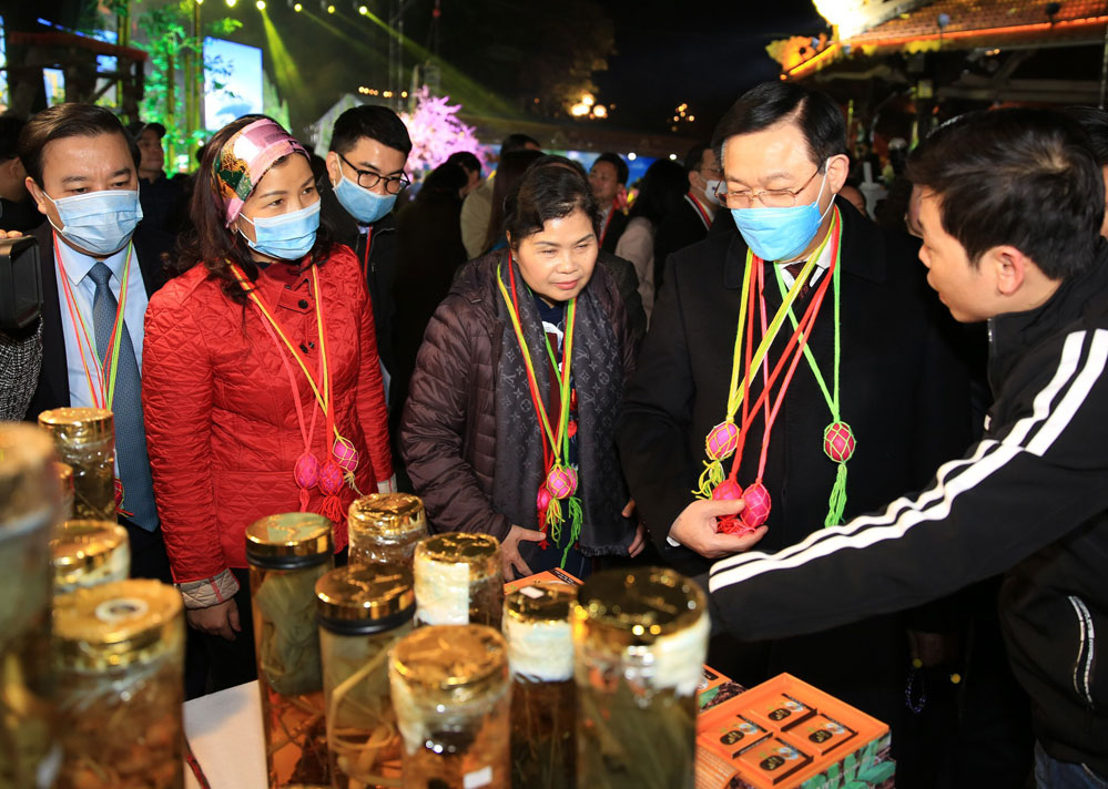 Politburo member Vuong Dinh Hue (second from right) and other delegates visit pavilions introducing Lai Chau's specialties. (Photo: hanoimoi)