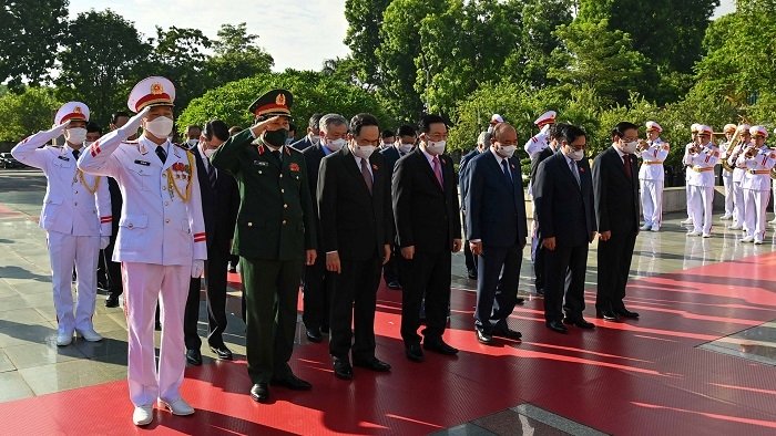 Leaders and former leaders of the Party and State pay tribute to President Ho Chi Minh at his mausoleum, Hanoi, July 27, 2021. (Photo: NDO/Duy Linh)