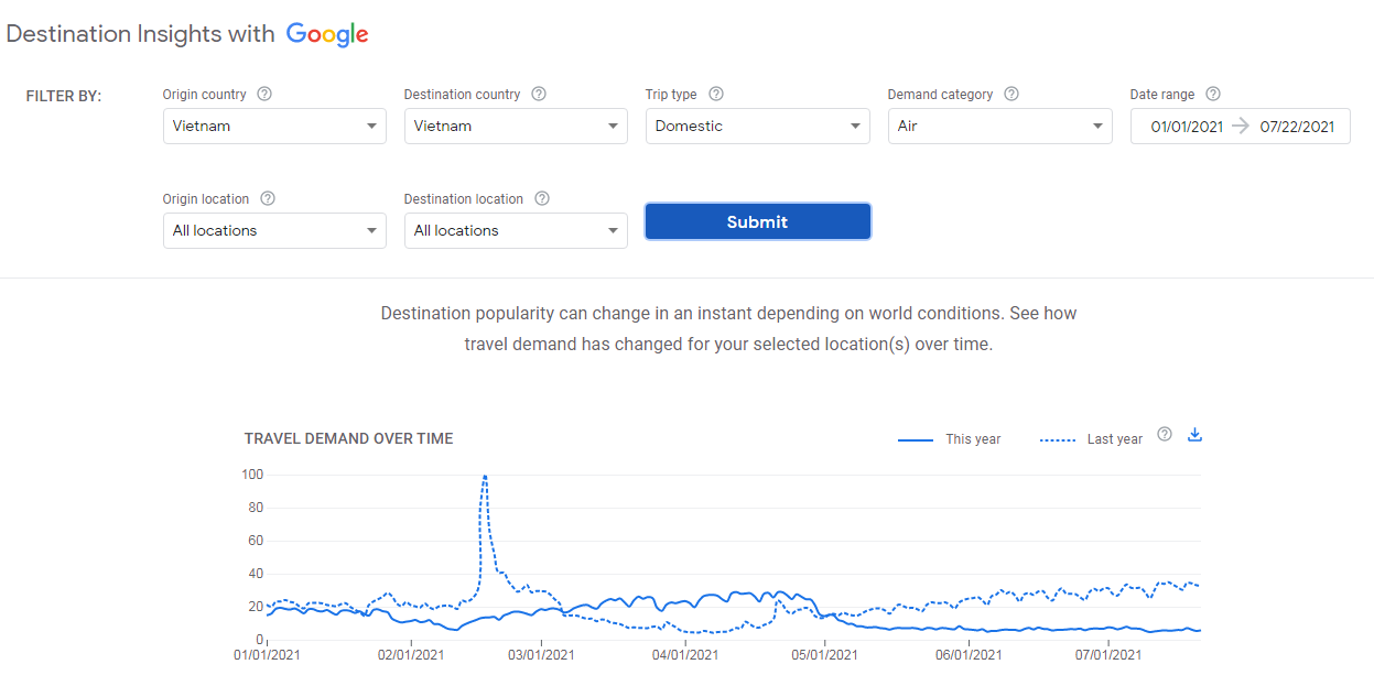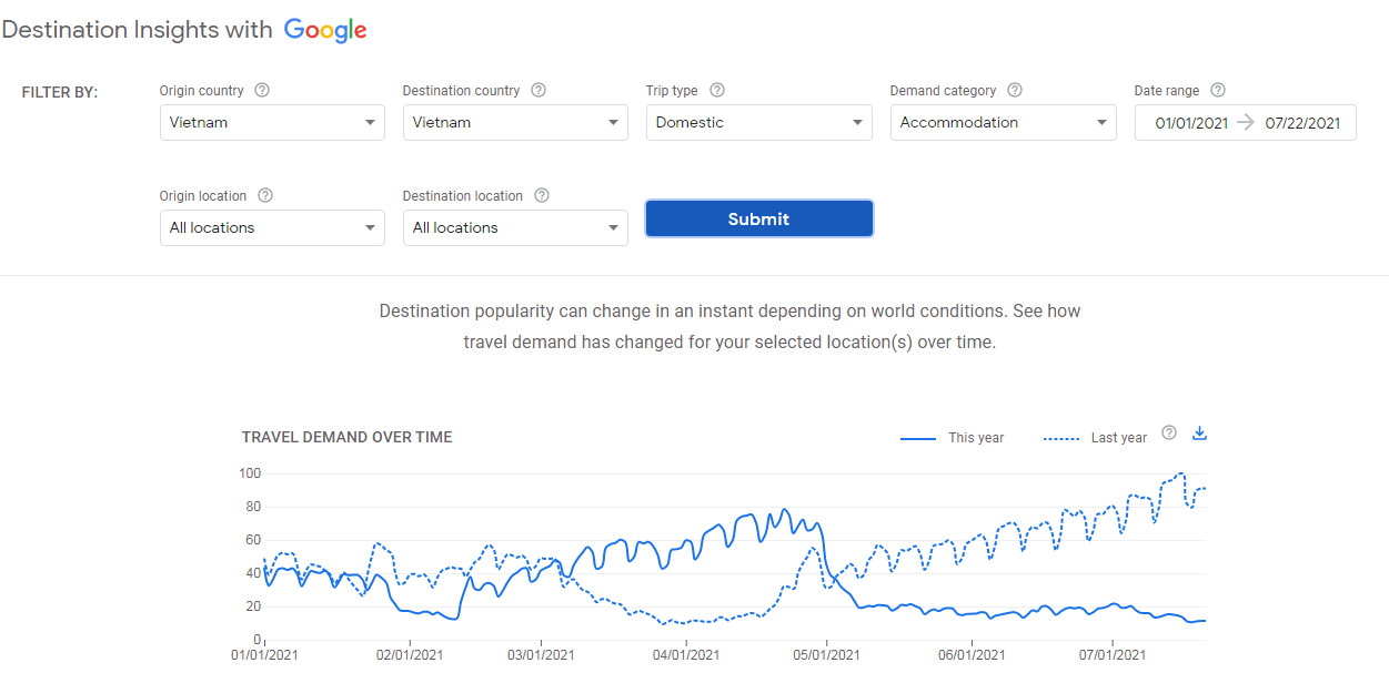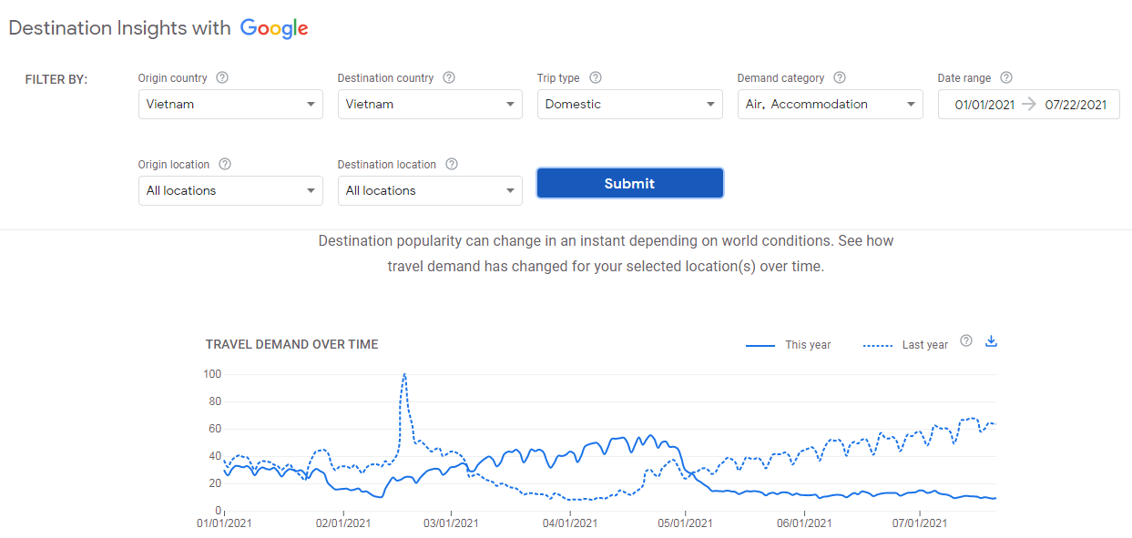 From the beginning of March to the end of April 2021, when the COVID-19 pandemic was under control, the demand of searching on domestic travel information increased sharply compared to the first 3 months of the year as well as compared to the same period of 2020. But from the end of April 2021, the 4th outbreak of pandemic in Viet Nam has happened, and then the search of domestic tourism rapidly decreased and remained at a very low level (figure 1).