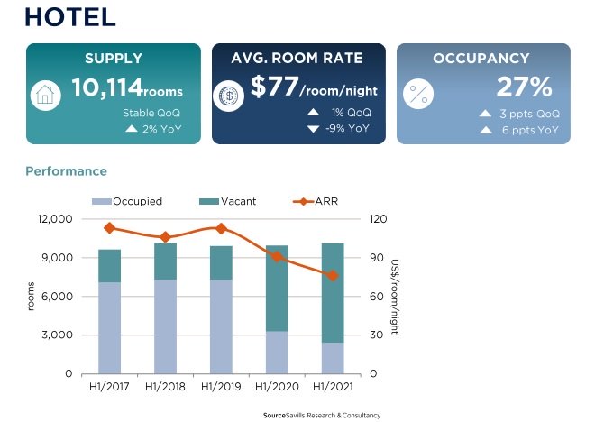 Although Hanoi’s hotel market recovered in April, the fourth wave of COVID-19 dragged the Q2 market occupancy down to 27%. However, it was still up 6% YoY as the social distancing policy was not as strict as in the previous year, the report stated.