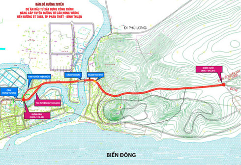 Trong đó, từ điểm đầu là cầu Hùng Vương sẽ phóng tuyến mới thẳng dọc theo sông Cầu Ké đến đoạn trước Công ty nước mắm Pisaco thì nhập với tuyến đường Nguyễn Thông cũ kéo dài đến trước khu đô thị phố biển Queen Pearl và vòng xoay đầu đại lộ Võ Nguyên Giáp.