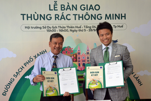 Đại diện Sở Du lịch và Bridgestone Việt Nam ký biên bản trao và nhận thùng rác thông minh