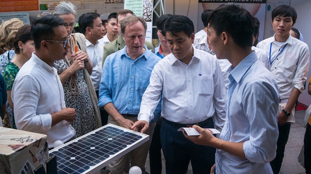 Chủ tịch UBND TP Hà Nội Nguyễn Đức Chung cùng Đại sứ Bruno Angelet tham quan mô hình năng lượng mặt trời mini tại triển lãm.