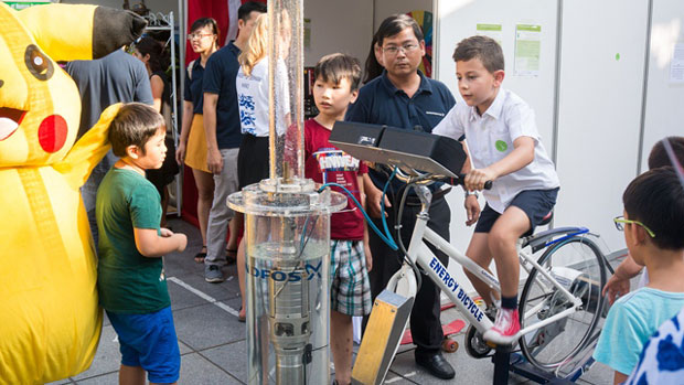 Các em nhỏ hào hứng với trải nghiệm “Xe đạp năng lượng”, sáng kiến chuyển đổi năng lượng cơ học thành điện năng sử dụng cho cho máy bơm nước, phát triển bởi Công ty Đan Mạch Grundfos.
