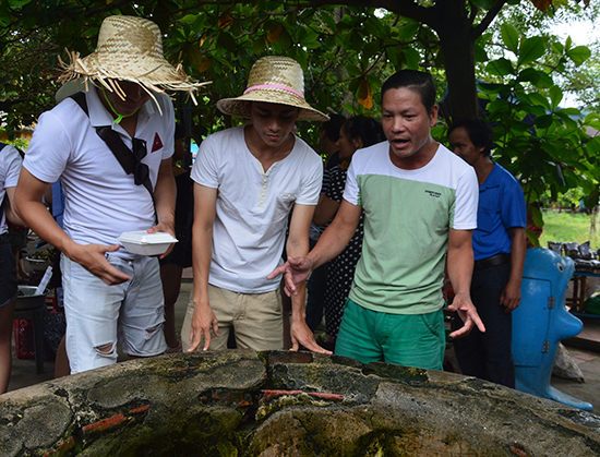 Võ Phúc Sinh (thứ nhất, bên phải) say sưa giới thiệu với du khách về giếng cổ ở đảo Cù Lao Chàm. Ảnh: N.Trang