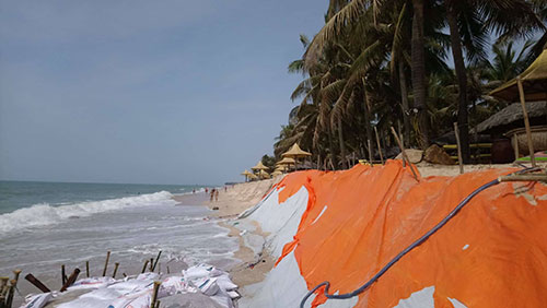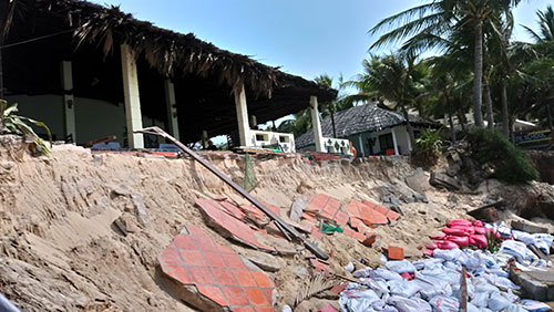 “Hơn 20 năm nay, chúng tôi chưa chứng kiến tình trạng sạt lở tương tự như hiện giờ. Để tránh tình trạng nước biển xâm thực ăn sâu vào khu vực nhà hàng, chúng tôi phải huy động hàng chục nhân viên, sử dụng bao ni-lông đựng cát và cọc tre làm đê bao nhằm hạn chế sóng biển đánh ập vào bờ. Tuy vậy, trước sức mạnh từ các đợt sóng tới tấp đánh vào, một góc chân kiềng của nhà hàng đã bị cuốn trôi” – anh Trịnh Đăng Thắng – đại diện khu du lịch Coco Beach nói.