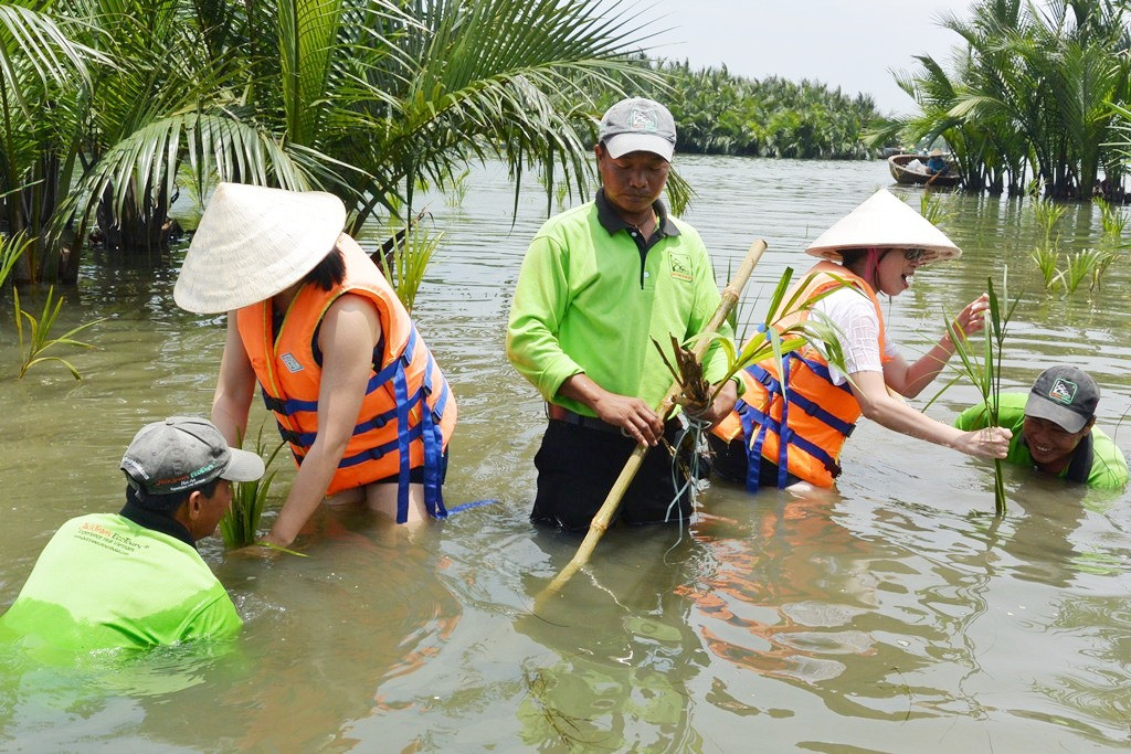 Du khách thích thú trải nghiệm tour du lịch trồng dừa nước để bảo vệ môi trường tại Cẩm Thanh