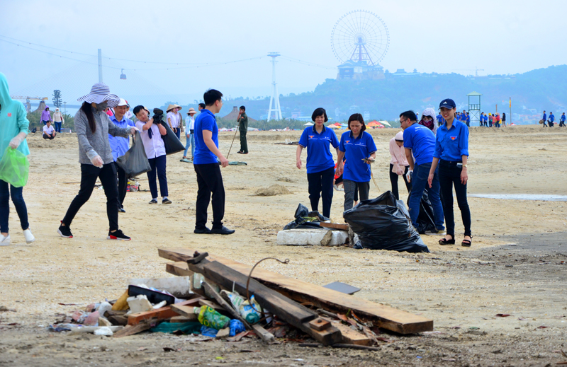 Lực lượng đoàn viên, thanh niên TP Hạ Long thu gom rác thải tại Khu du lịch Bãi Cháy. Ảnh: Tạ Quân