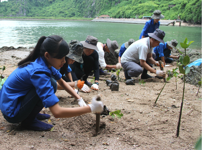 Các tình nguyện viên trồng rừng ngập mặn tại khu vực hang Đầu Gỗ, Vịnh Hạ Long. Ảnh: Ngô Yến (CTV)