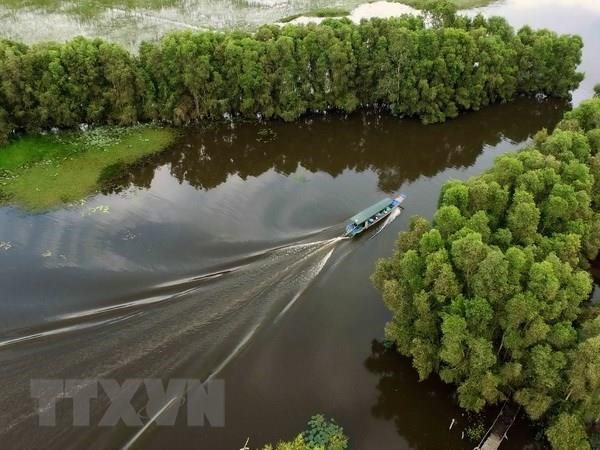 Du khách tham quan vườn quốc gia Tràm Chim bằng xuồng máy. (Ảnh: An Hiếu/TTXVN)