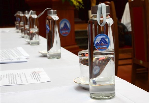 Sử dụng chai thủy tinh đựng nước nhằm góp phần tuyên truyền ý thức bảo vệ môi trường trong các cuộc họp tại thành phố Đà Nẵng. (Ảnh: Quốc Dũng/TTXVN)