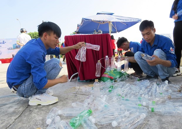 Các đoàn viên, thanh niên Đại học Quảng Bình tái chế các chai nhựa thành các vật dụng hữu ích cho cuộc sống. (Ảnh: Võ Dung/TTXVN)
