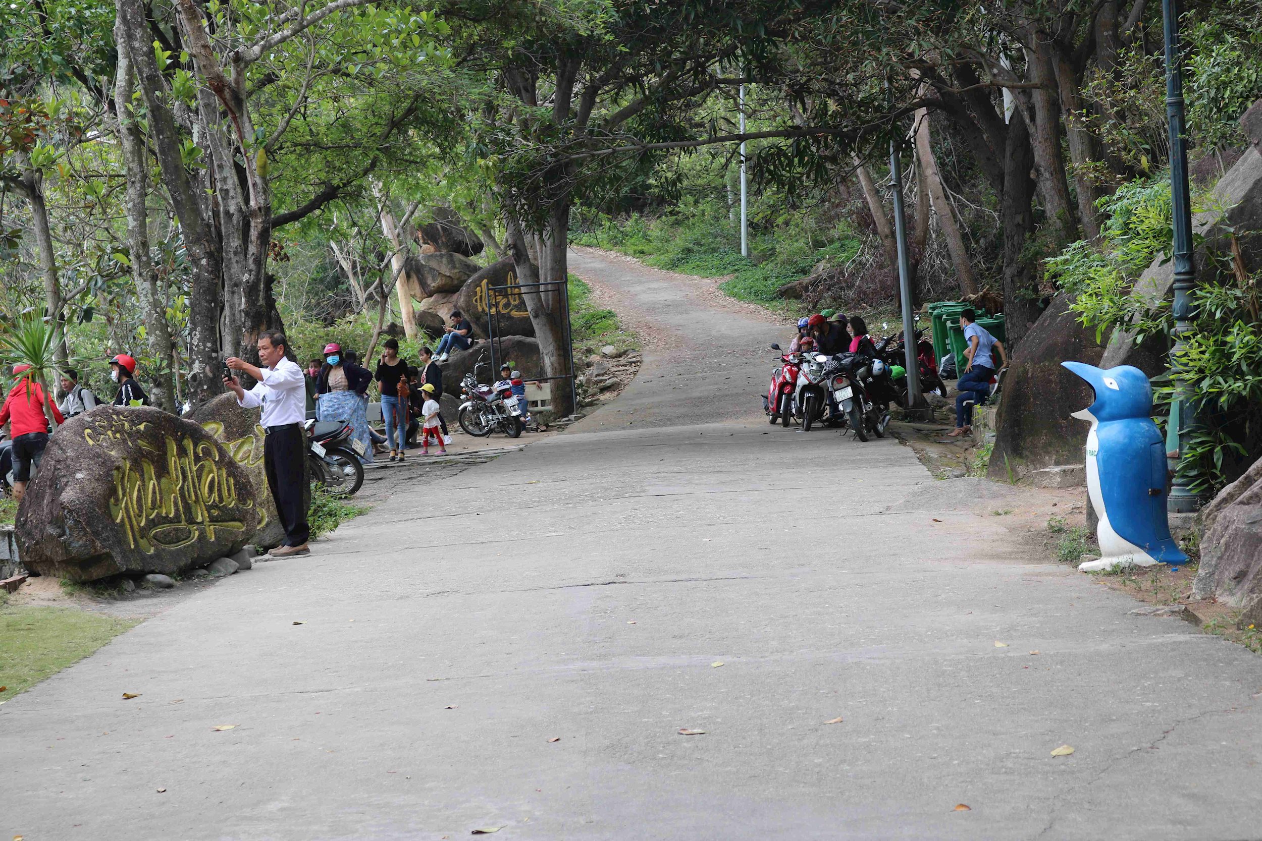 Khu di tích danh lam thắng cảnh Ghềnh Ráng tại phường Ghềnh Ráng, thành phố Quy Nhơn. Tại mỗi bóng cây xanh luôn có chú chim cánh cụt đang há miệng chờ đợi mọi người bỏ rác vào người mình.