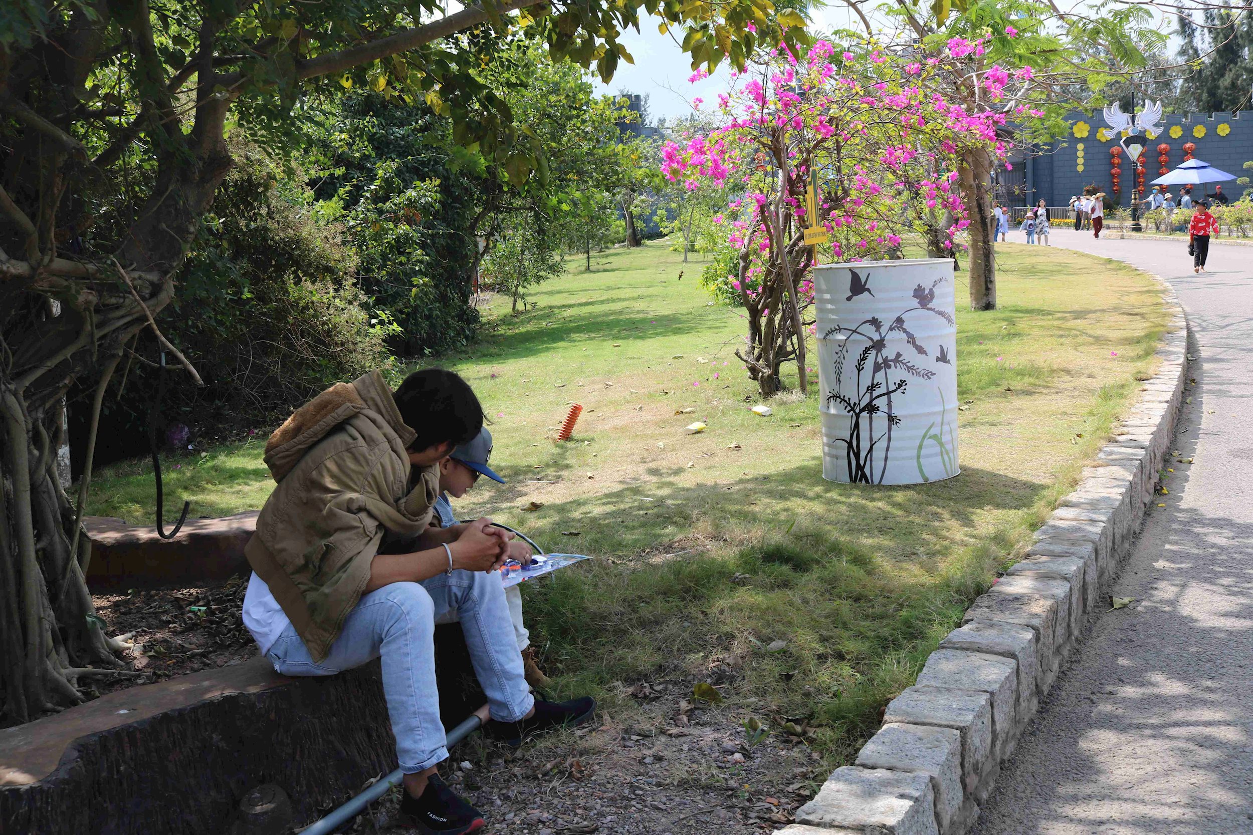 Không chỉ hình khối thùng rác ông mặt trời, ngôi sao, còn có hình hoa trắng trên nền màu xanh lá cây, xanh cốm, xanh lam, hay thùng rác có hình cây liễu đung đưa trong gió với chú chim đang bay lượn bầu trời đã tạo nên không gian sống động, đẹp mắt, mới lạ, độc đáo cho khu du lịch.