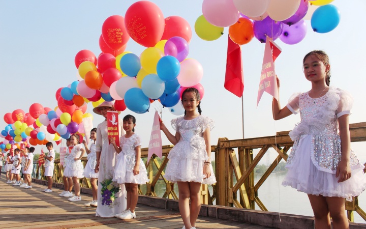 Học sinh Quảng Trị thể hiện tiết mục nguyện cầu hòa bình tại di tích cầu Hiền Lương.