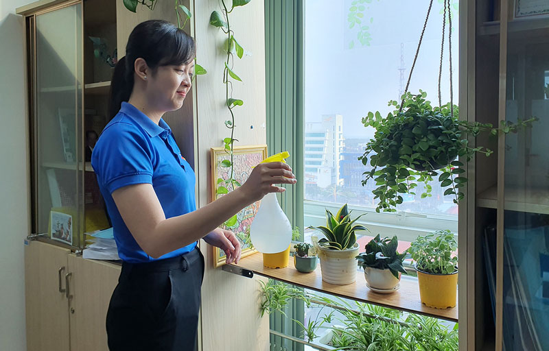 Ngoài ra, mỗi cá nhân tự chuẩn bị một chậu cây yêu thích để bài trí tại góc làm việc và trang trí trong phòng sao cho hài hòa và phù hợp với không gian chung của phòng, ban, cơ quan. Tại không gian sinh hoạt chung của đơn vị như: hành lang, cầu thang, sảnh thang máy cũng được bố trí các loại cây xanh do đoàn viên chăm sóc.