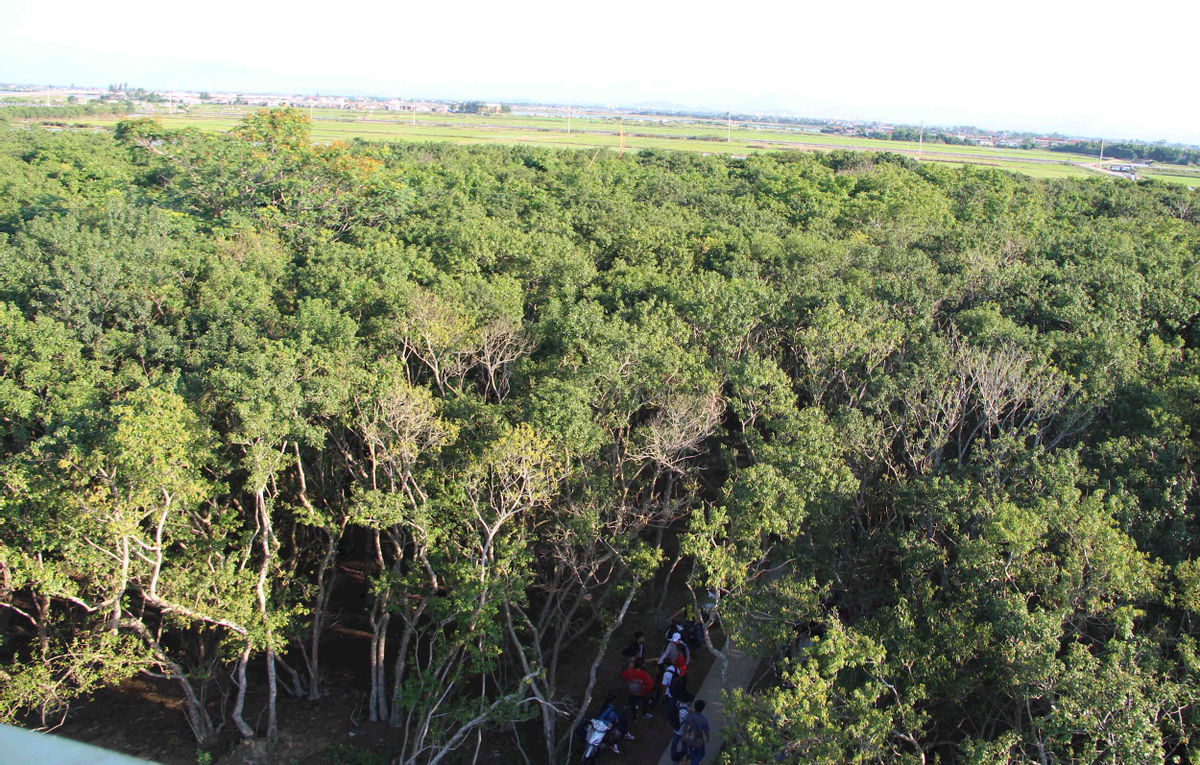 Cái tên Rú Chá hình thành từ xưa bởi ở đây đa phần là cây chá, mọc tự nhiên. Luồn lách dưới những vòm cây chá, trong không gian mát rượi của rừng cây và gió biển, sẽ phát hiện ra những cây chá tuy không cao nhưng lại có bộ rễ thật to, bám chặt vào lòng đất, nơi những chú còng dùng làm nơi trú ẩn, sống chung với loài chá còn nhiều loài cây rừng ngập mặn khác.