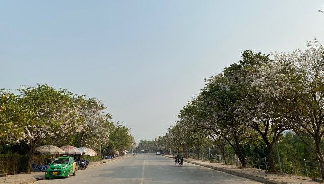 Đoạn đường lối rẽ vào hầm Đờ - cát, TP. Điện Biên Phủ, hoa ban nở trắng muốt hai bên đường tạo điểm nhấn thanh bình, thơ mộng cho thành phố núi.