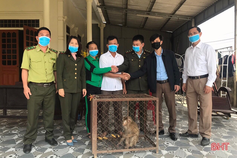 Gia đình ông Phan Văn Túc, trú tại TDP Hợp Tiến, phường Thạch Linh, TP Hà Tĩnh vừa tự nguyện giao nộp cho Vườn Quốc gia Vũ Quang 1 cá thể khỉ đuôi lợn có trọng lượng khoảng 5kg để chăm sóc, cứu hộ