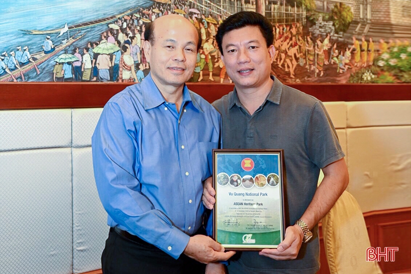 Ông Nguyễn Danh Kỳ (bên phải) - Giám đốc Vườn Quốc gia Vũ Quang tham dự hội nghị và nhận danh hiệu Vườn Di sản ASEAN cho Vườn Quốc gia Vũ Quang từ hội đồng AHP. (Ảnh chụp tháng 10/2019)