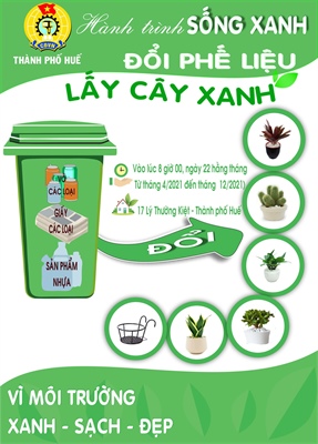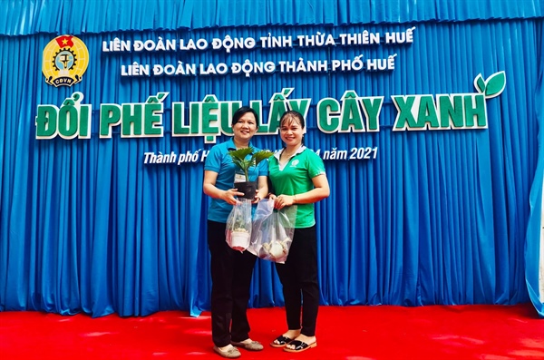 Liên đoàn Lao động TP Huế đã kết nối với một cơ sở thu gom phế liệu và một cơ sở chuyên ươm và cung cấp cây xanh để thực hiện chương trình “Đổi phế liệu lấy cây xanh”. Theo đại diện Liên đoàn Lao động TP Huế, chỉ trong buổi đầu tiên của chương trình “Đổi phế liệu lấy cây xanh” vào tháng 4 vừa qua, đã thu được 2,5 tấn phế liệu và đổi được gần 500 cây xanh.