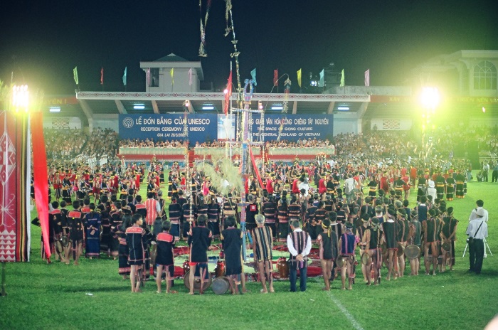 Quang cảnh lễ đón bằng của UNESCO công nhận Không gian văn hóa cồng chiêng Tây Nguyên là di sản văn hóa phi vật thể đại diện của nhân loại. Ảnh: Thanh Nhật